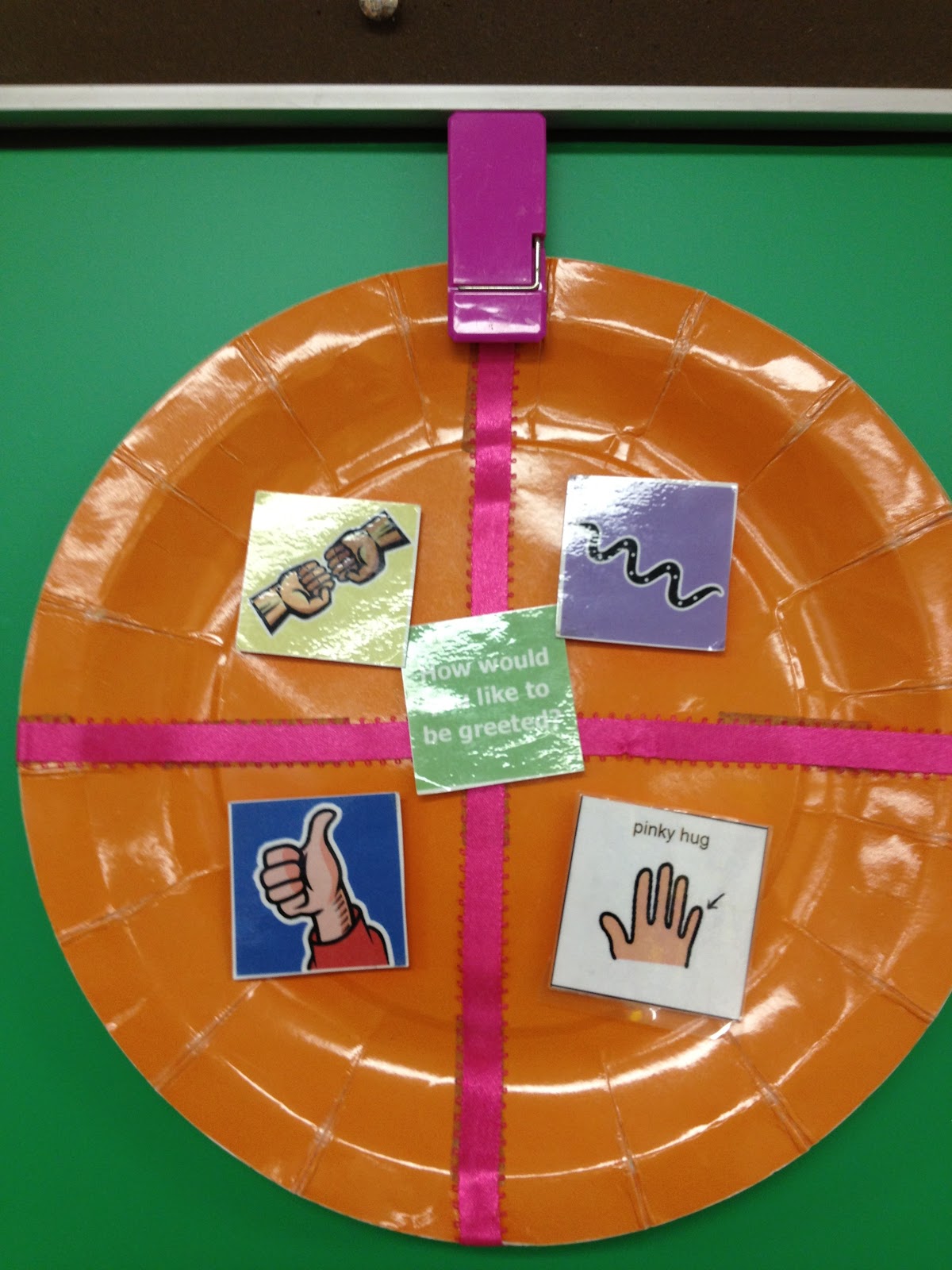 In addition to being greeted by the teacher upon arrival each day, my students are also greeted by one of their peers at circle time each day.  Every student in my School Family has a meaningful job.  One of those jobs is the Greeter.  As a part of circle time, my greeter goes around and asks the question "How would you like to be greeted today?"  We alter the question according to the verbal ability of each student.  For a child who is nonverbal, we use a communication device and they push a button to ask the question.